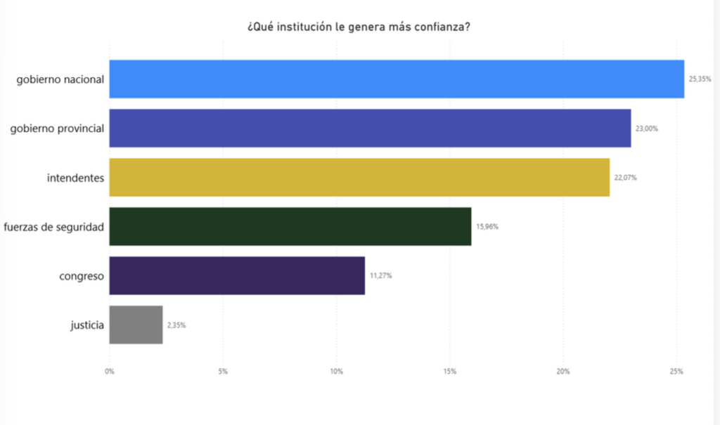 Gobierno nacional, provincial e intendentes registran niveles similares de confianza. No existe una institución que concentre credibilidad de manera clara. En cambio, Congreso y Justicia exhiben niveles más bajos, profundizando la percepción de crisis en los espacios de representación.
