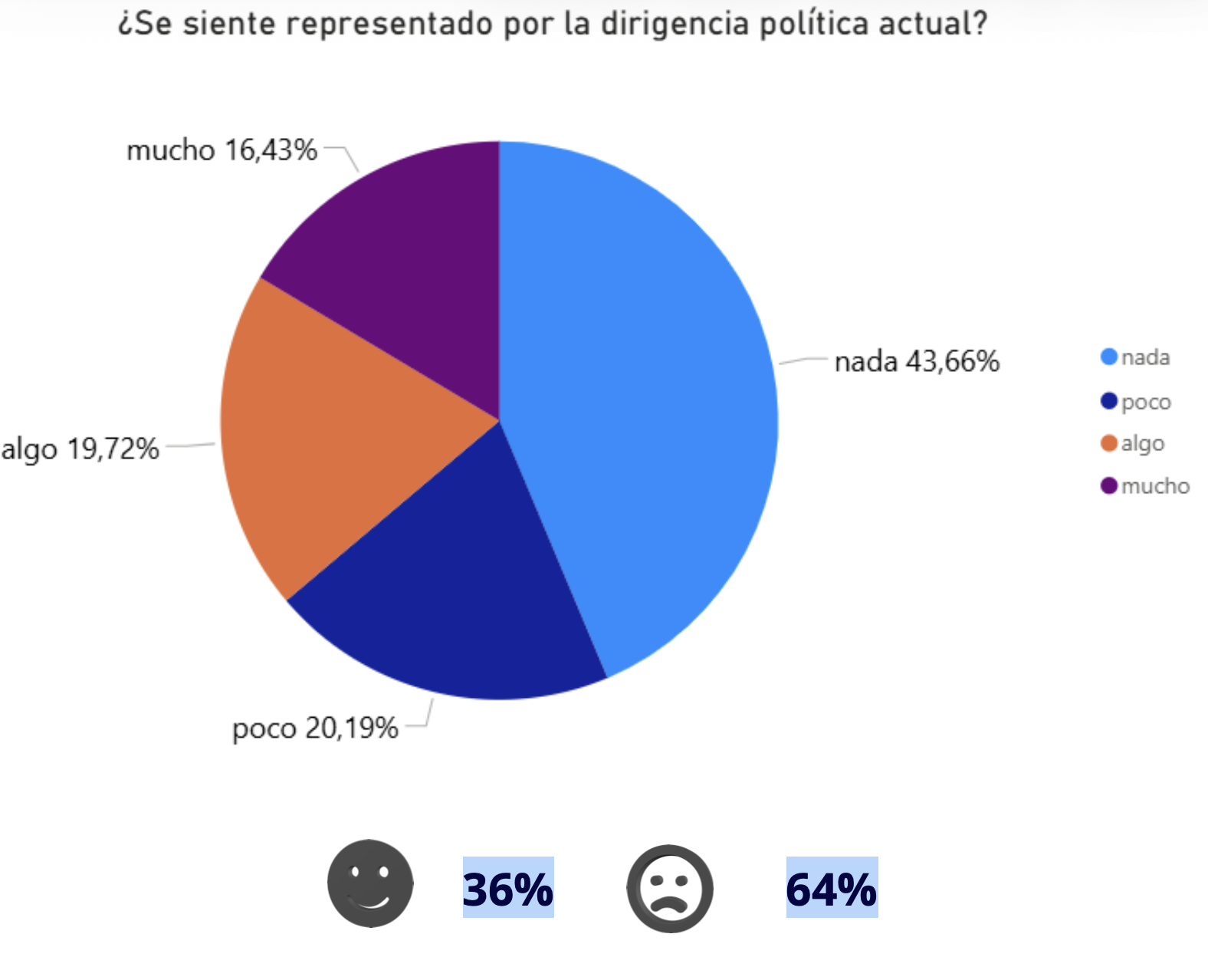 El 64% de los encuestados afirma sentirse “nada” o “poco” representado por la dirigencia actual. Solo el 36% expresa algún nivel de representación. La mayoría percibe un déficit claro en la intermediación política.
