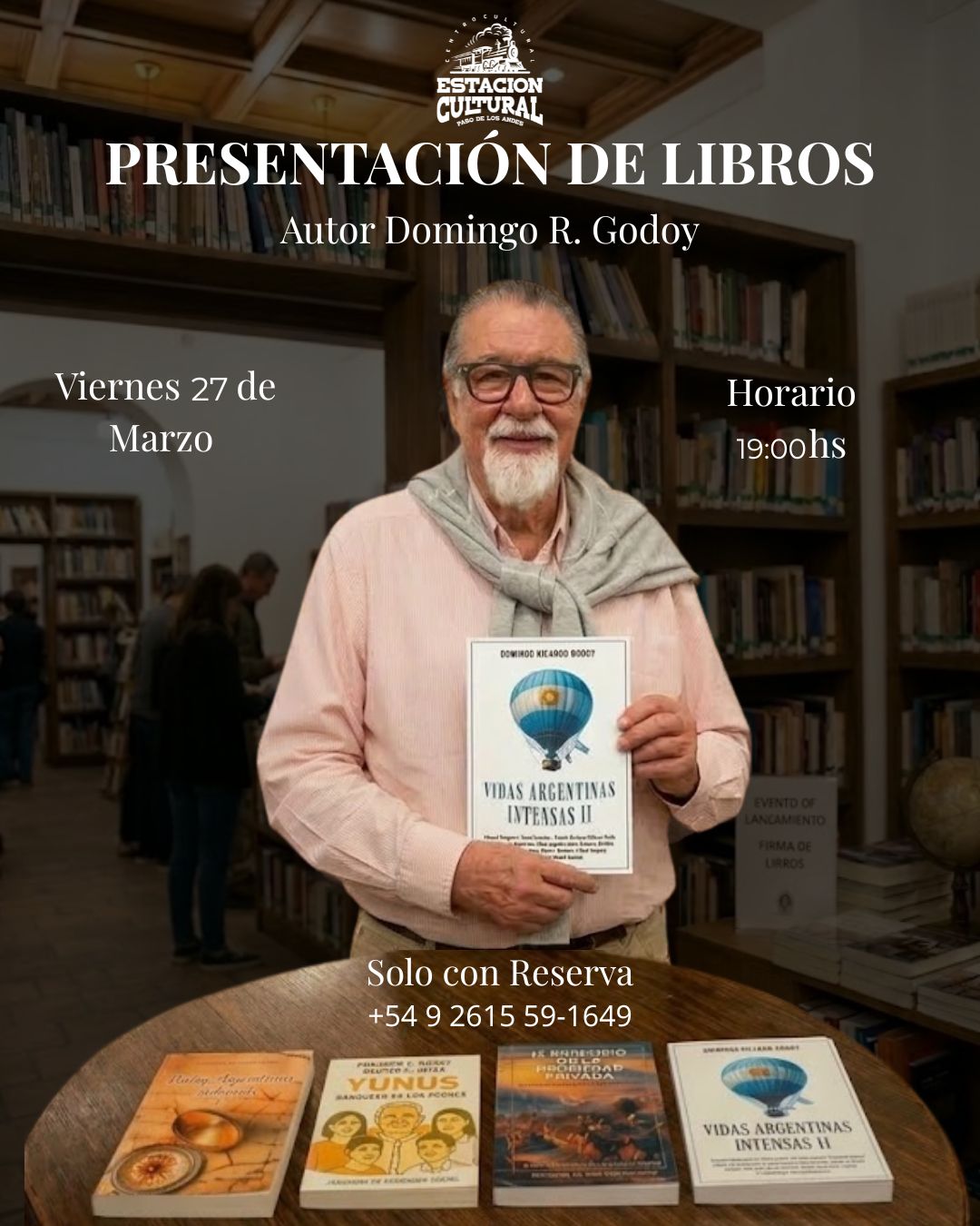 La Estación Cultural Paso de los Andes será escenario de una nueva propuesta literaria con la presentación de libros del autor Domingo R. Godoy, quien dará a conocer su obra en un encuentro previsto para el viernes 27 de marzo a las 19 horas.