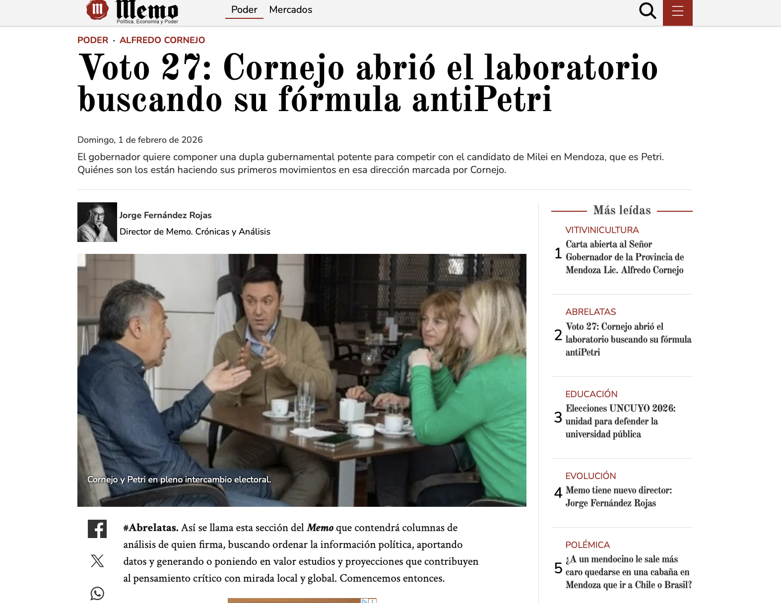 Con el debut de la nueva sección de análisis de Memo y el estreno de Jorge Fernández Rojas como director del medio, una columna pone en foco los primeros movimientos del gobernador Alfredo Cornejo, la figura de Luis Petri y un tablero electoral que empieza a ordenarse aun sin calendario inmediato.