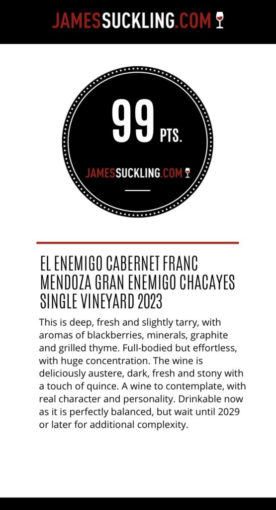 El tercer reconocimiento fue para el El Enemigo Cabernet Franc Mendoza Gran Enemigo Chacayes Single Vineyard 2023, que obtuvo 99 puntos. Este vino se caracteriza por su profundidad aromática, con notas de moras, grafito, minerales y hierbas grilladas. De gran concentración pero elegante, combina austeridad y frescura, con un perfil equilibrado que permite disfrutarlo en el presente, aunque con potencial de complejidad en los próximos años.