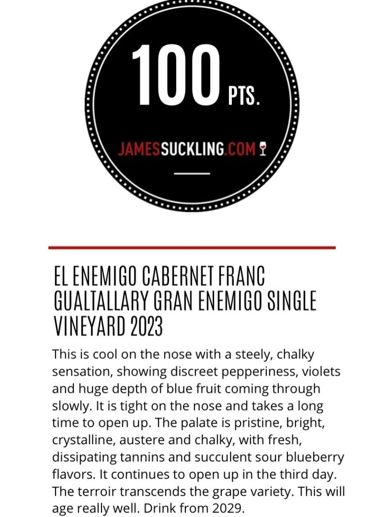 También con puntaje perfecto se ubica el El Enemigo Cabernet Franc Gualtallary Gran Enemigo Single Vineyard 2023, un vino descrito como preciso, fresco y de gran estructura. En nariz muestra un perfil contenido que evoluciona con el tiempo, mientras que en boca combina acidez, textura calcárea y notas de frutas azules. La crítica resalta su capacidad de evolución y recomienda su consumo a partir de 2029.