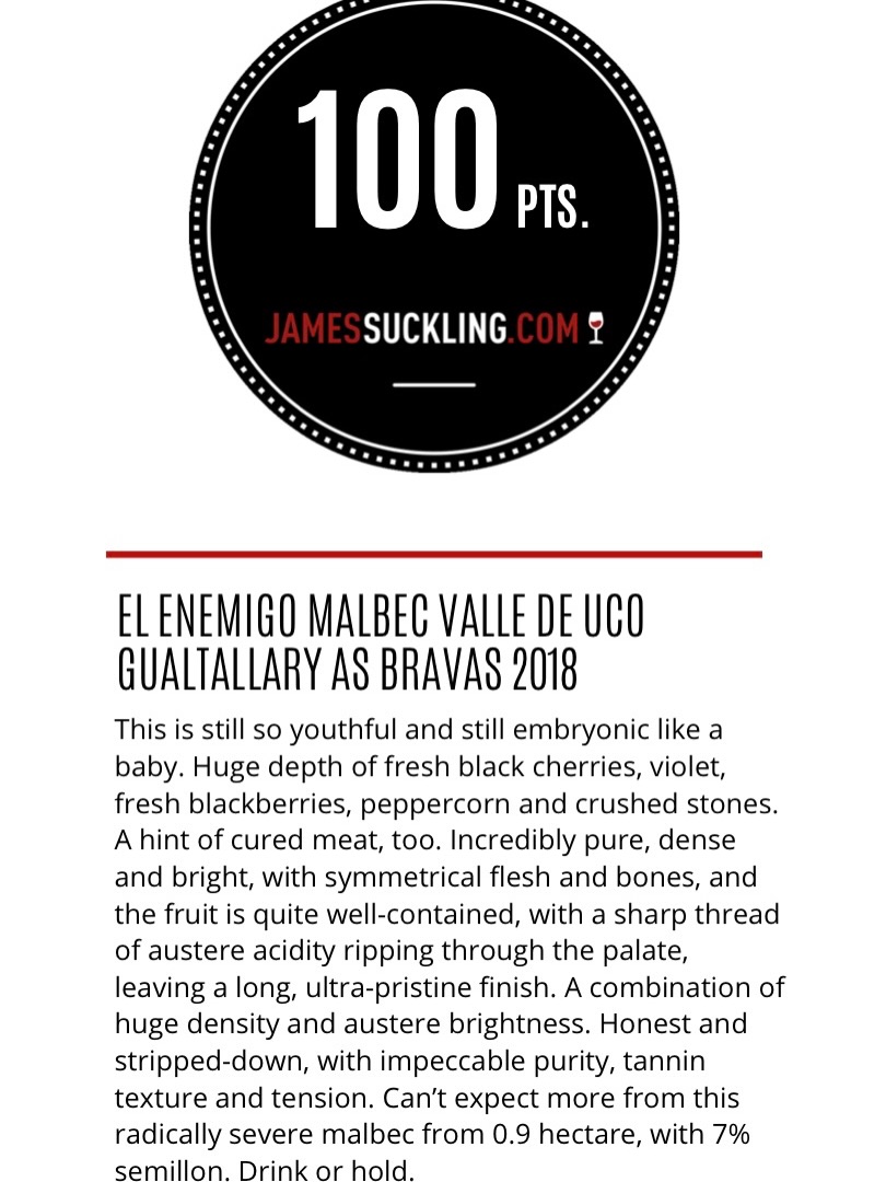 Entre los máximos puntajes se destaca el El Enemigo Malbec Gualtallary As Bravas 2018, que recibió 100 puntos. Según la crítica, se trata de un vino aún joven pero con enorme profundidad, donde aparecen notas de cerezas negras, violetas, moras, pimienta y una marcada mineralidad. Su perfil austero, con acidez filosa y gran pureza, lo posiciona como un Malbec de carácter extremo y alta tensión, con potencial de guarda.