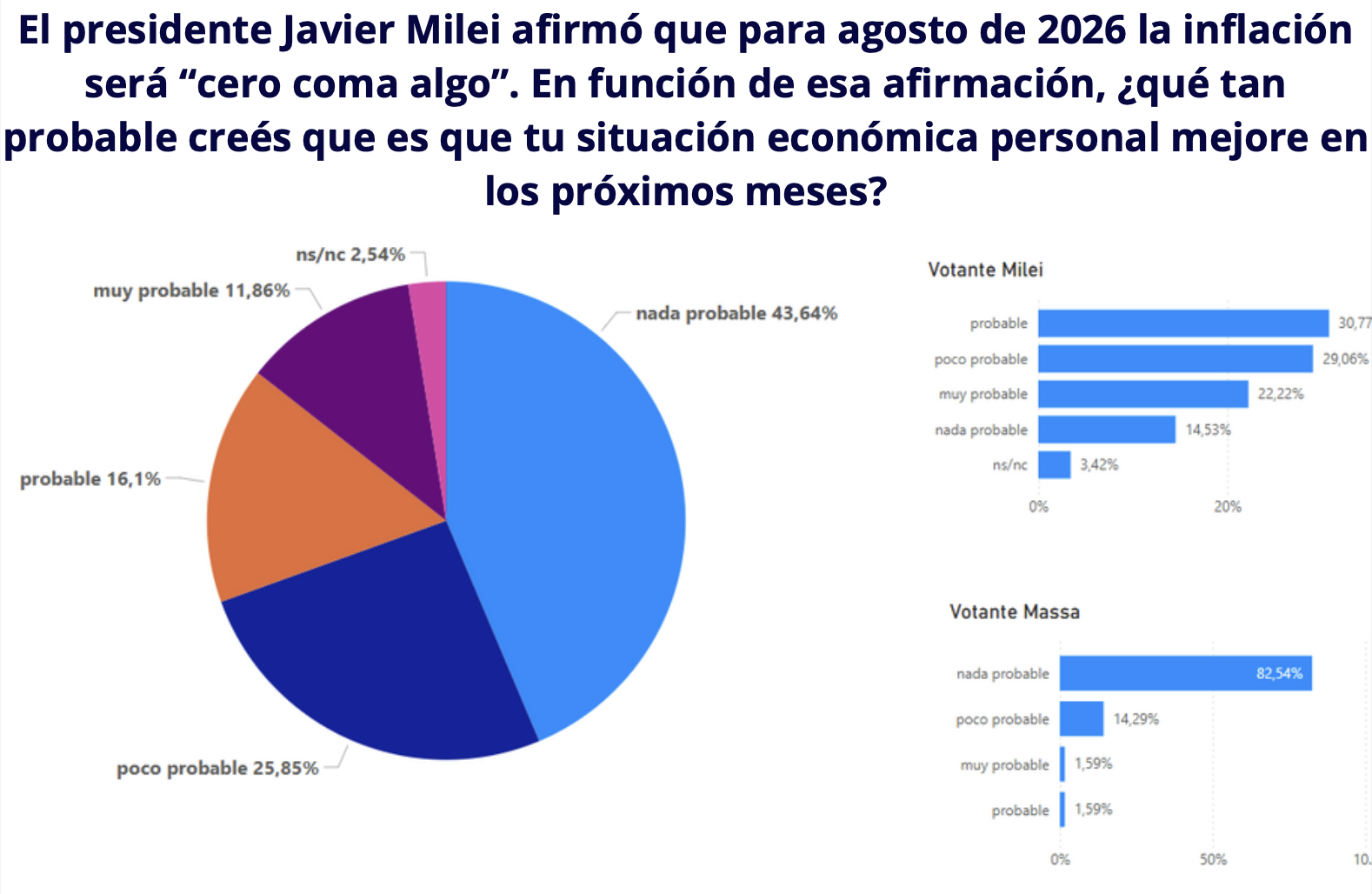 La expectativa de mejora económica personal en el corto plazo aparece limitada, incluso frente a proyecciones oficiales optimistas. Consultados sobre la posibilidad de que su situación mejore en los próximos meses, a partir de la afirmación presidencial de una inflación cercana a cero hacia agosto de 2026, predomina el escepticismo, lo que refleja cautela social ante el escenario económico.
