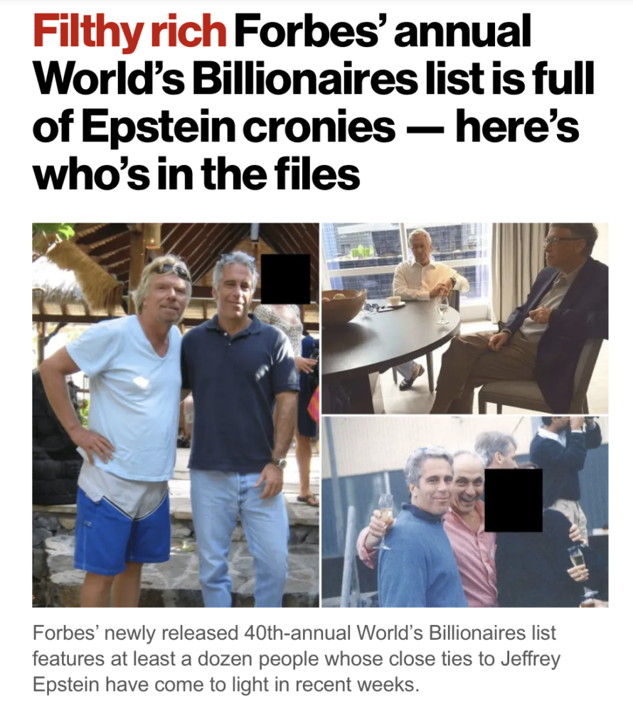 La lista anual de multimillonarios de Forbes 2026 incluye 3.428 personas, y el reportaje sostiene que decenas de esos nombres aparecen mencionados en documentos y registros vinculados a Epstein, con distintos niveles de relación o interacción.