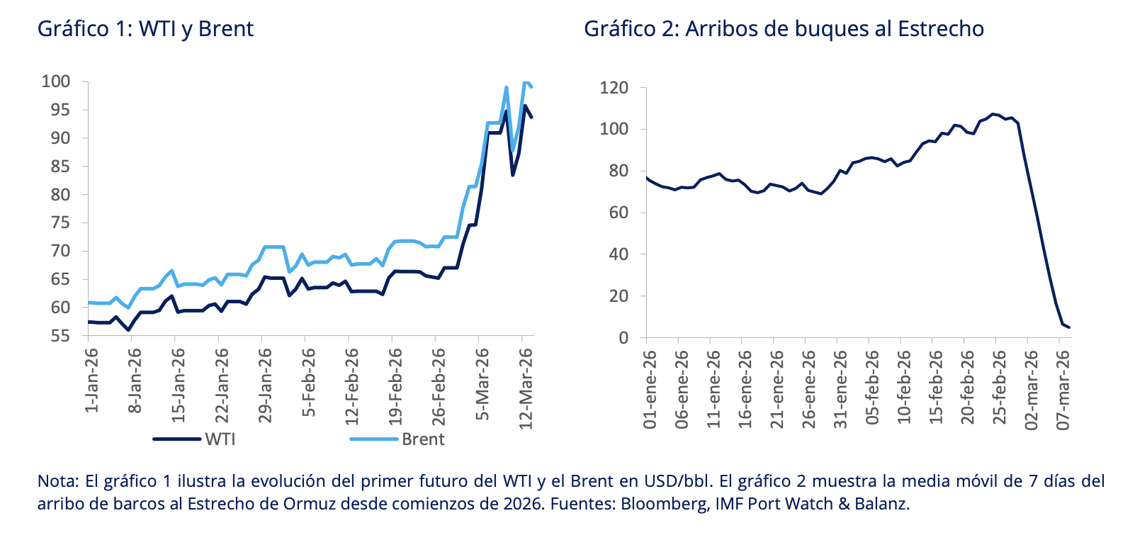 | La niebla de la guerra – En la segunda semana del conflicto en Medio Oriente, la incertidumbre sigue creciendo, afectando la visibilidad sobre el precio del petróleo en el corto plazo. – Después de haber tocado USD/bbl 120 el lunes, el precio del crudo cedió temporalmente con los comentarios del presidente Trump de que el conflicto sería de corto plazo y que Estados Unidos estaba muy avanzado en el conflicto. Sin embargo, la escalada subsiguiente en la región con los ataques iraníes a países e infraestructura vecina, así como también hacia algunas embarcaciones volvieron a generar presión sobre los precios, llevándolos a los USD 100 por barril. – El shock de oferta de 2026 se distingue de episodios históricos no solo por su magnitud sin precedentes, estimada entre un 10-20% de la producción mundial, sino por su naturaleza logística y generalizada, que ha paralizado la capacidad de exportación en múltiples países clave de la OPEP de una sola vez. – El petróleo por encima de 100 dólares por barril es efectivamente ruidoso, pero comparando de manera equivalente en poder de compra, el Brent tendría que llegar a USD/bbl 150 para ver niveles equiparables a los experimentados en 2011-2014. – En caso de que el cierre del Estrecho de Ormuz se prolongue, no parece improbable pensar que el precio del petróleo pueda llegar a niveles cercanos a los USD 150 por barril. – Si bien en términos reales y ajustado por intensidad un precio del petróleo en USD 150 por barril no es tan alto en términos históricos, la velocidad y magnitud de la suba puede hacer que haya destrucción de demanda si alcanza un nivel elevado en el corto plazo. – En medio de la gravedad de la situación, la respuesta coordinada de la Agencia Internacional de Energía para mitigar el impacto mediante la liberación de reservas estratégicas es proporcionalmente mayor que en intervenciones anteriores, alcanzando hasta 400 millones de barriles en esta ocasión. EE.UU. liberará 172 millones de sus reservas estratégicas. – En eventos previos de uso de reservas estratégicas, el precio del crudo tendió a estabilizarse tras la liberación coordinada de reservas estratégicas, aunque la evolución posterior terminó siendo heterogénea. – Si bien el petróleo coqueteó con los niveles vistos en el inicio de la invasión de Rusia a Ucrania, el contexto económico actual dista mucho del que se tenía en ese momento. – La inflación a nivel global era considerablemente más elevada que la actual, en buena medida por los efectos de la política de estímulo fiscal y monetario en el contexto de la pandemia en 2020 y porque existían problemas con las cadenas de suministro. – En cuanto a la postura de la política monetaria, esta también luce mucho mejor hoy que lo que estaba en 2022, principalmente porque las tasas están en un nivel mayor que a inicios del conflicto Rusia – Ucrania. |