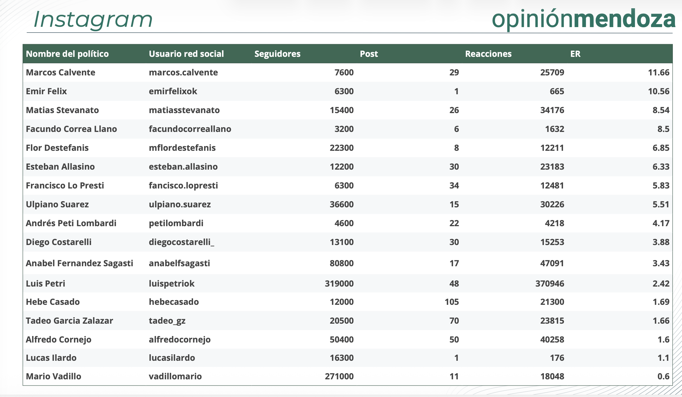 En Instagram, Luis Petri y Alfredo Cornejo lideran en volumen de seguidores, superando ampliamente al resto del sistema político provincial. Sin embargo, dirigentes como Anabel Fernández Sagasti y Marcos Calvente muestran niveles de engagement más altos, con comunidades más activas en proporción a su tamaño.