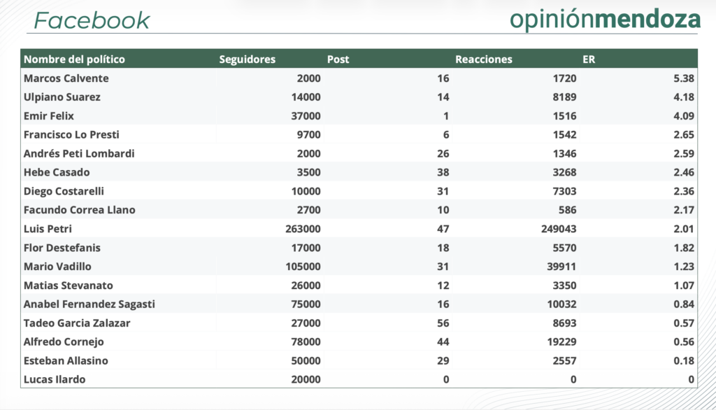 En Facebook, Cornejo se posiciona como uno de los perfiles con mayor alcance, mientras que otros dirigentes logran niveles de interacción más eficientes en relación a su base de seguidores.