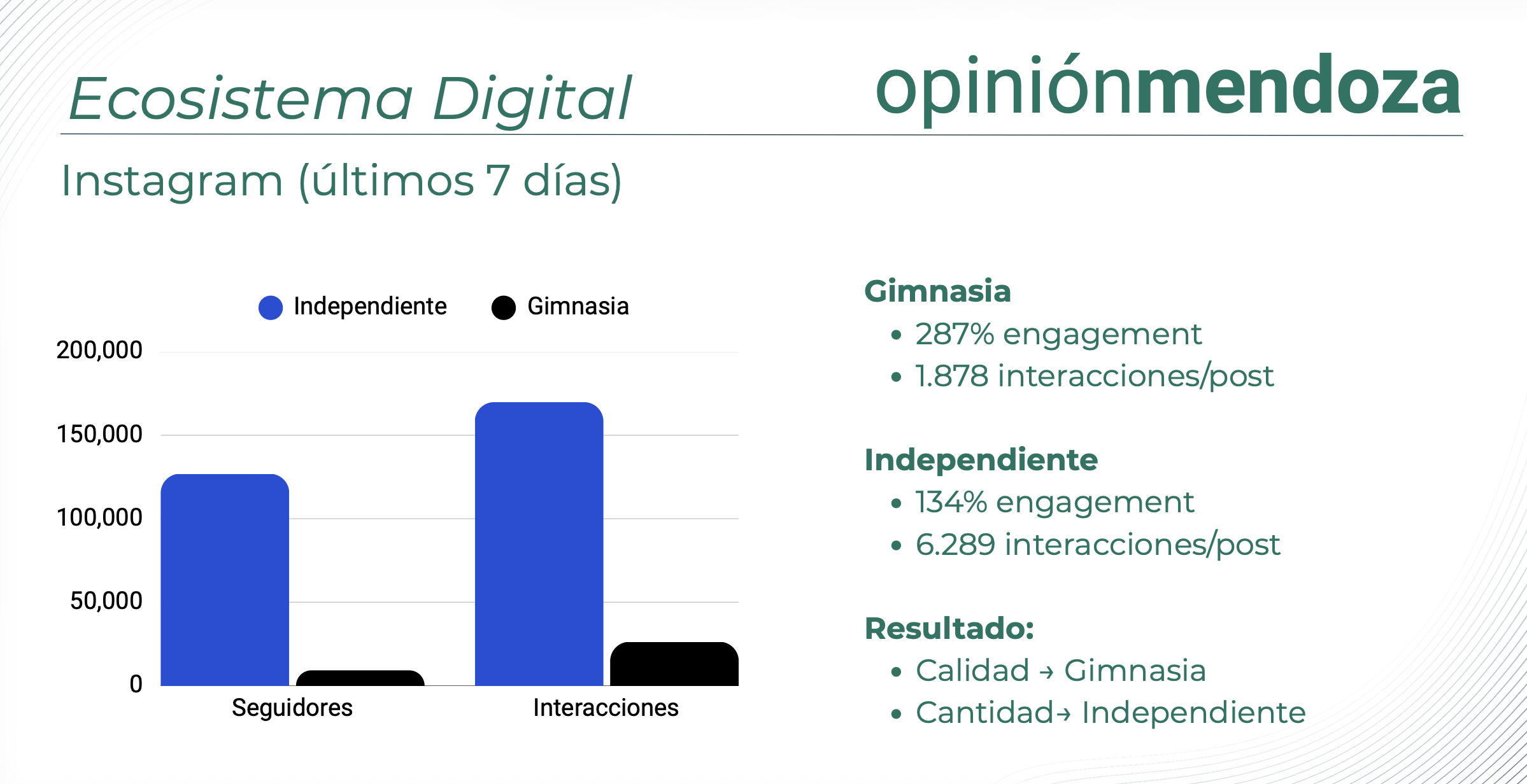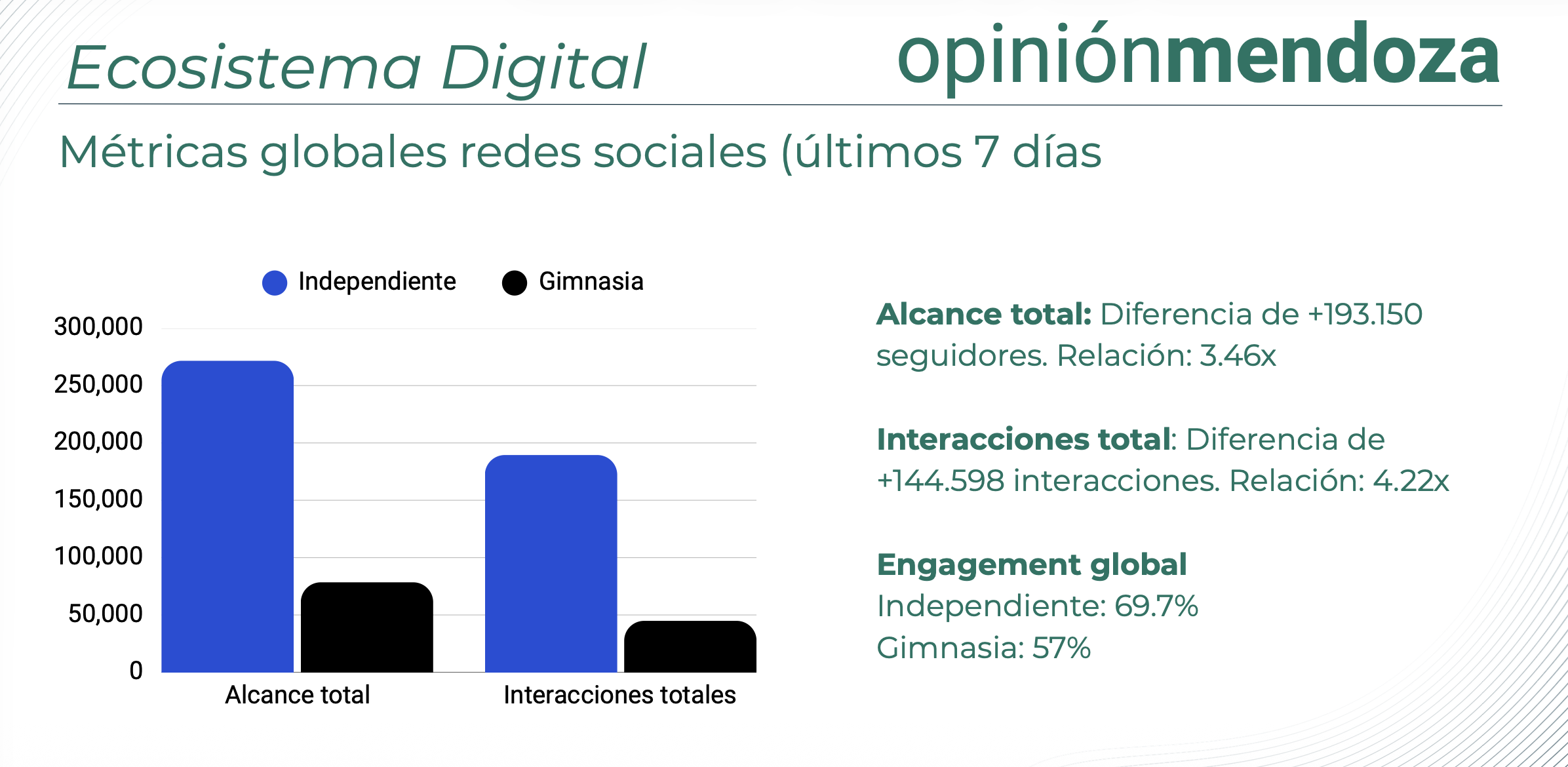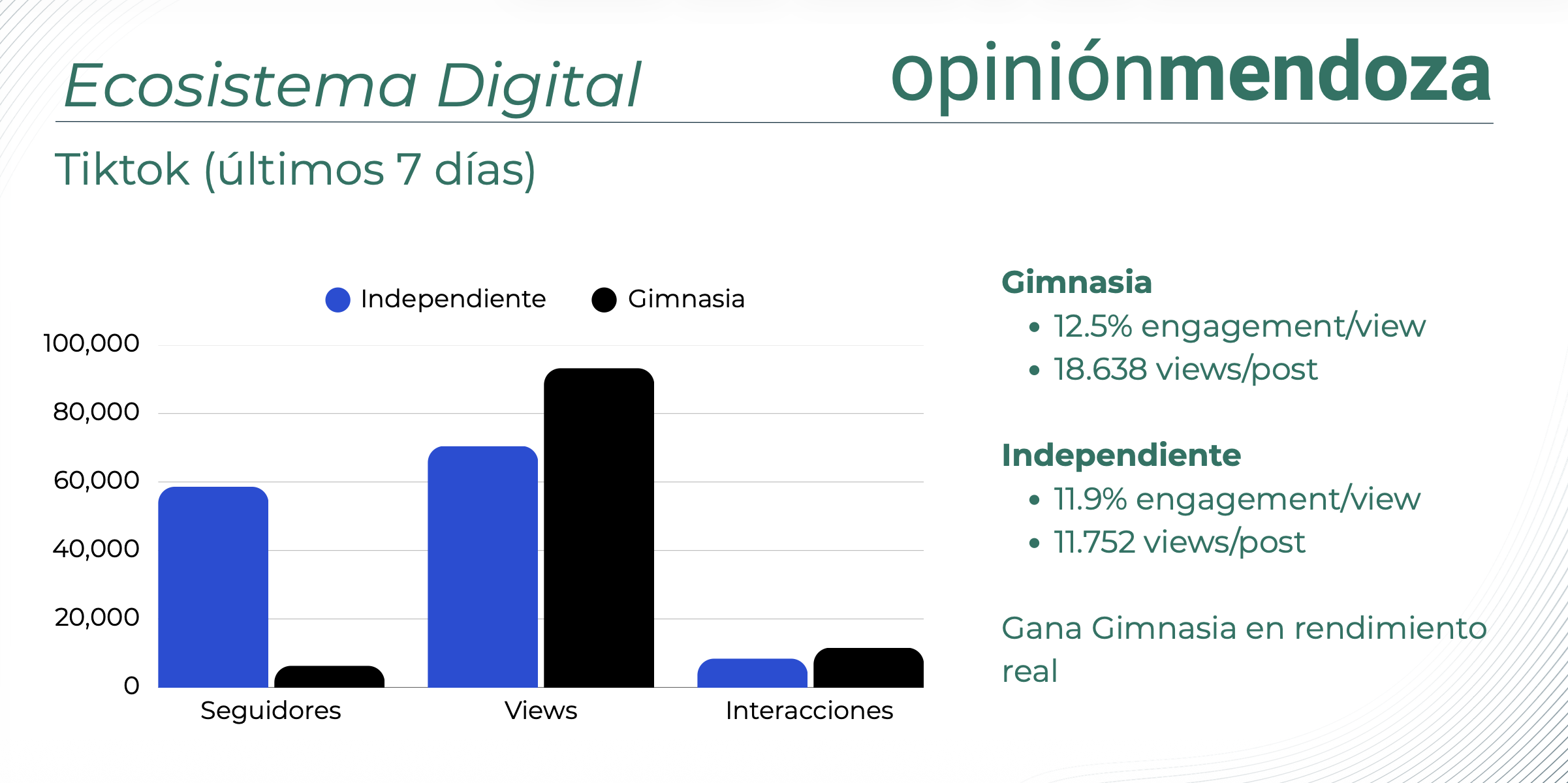 Aunque Independiente tiene más interacciones acumuladas (superando las 189.000), Gimnasia exhibe un rendimiento relativo superior en plataformas específicas.