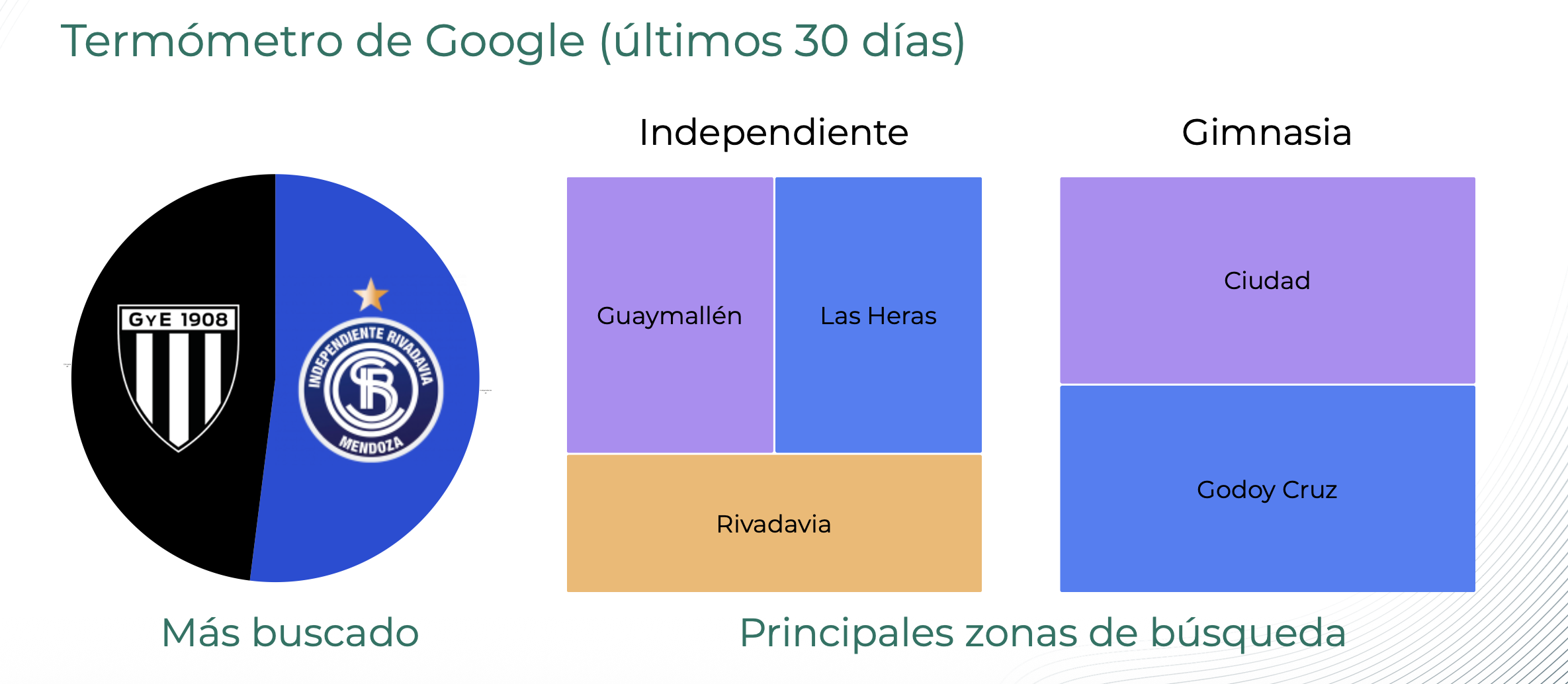 El comportamiento en Google confirma que el clásico monopoliza la conversación pública. El 58% de las búsquedas relacionadas con el evento se concentran en Independiente Rivadavia. No obstante, en las 24 horas previas al relevamiento, Gimnasia experimentó un pico de crecimiento del 120%, impulsado por consultas sobre «entradas» y «formación».