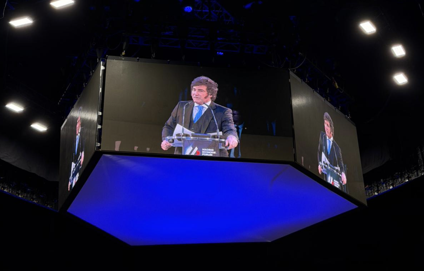 Milei fue presentado en el escenario con su habitual canción de la banda La Renga, un sello característico de sus apariciones públicas. Ya en su exposición, sostuvo que “la eficiencia y la justicia son dos caras de la misma moneda”, una idea que, según explicó, se opone al “utilitarismo político”.