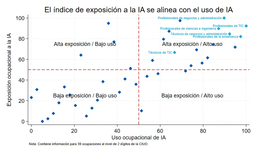 - Los trabajos con alta exposición prevista muestran altos niveles de uso real de IA.