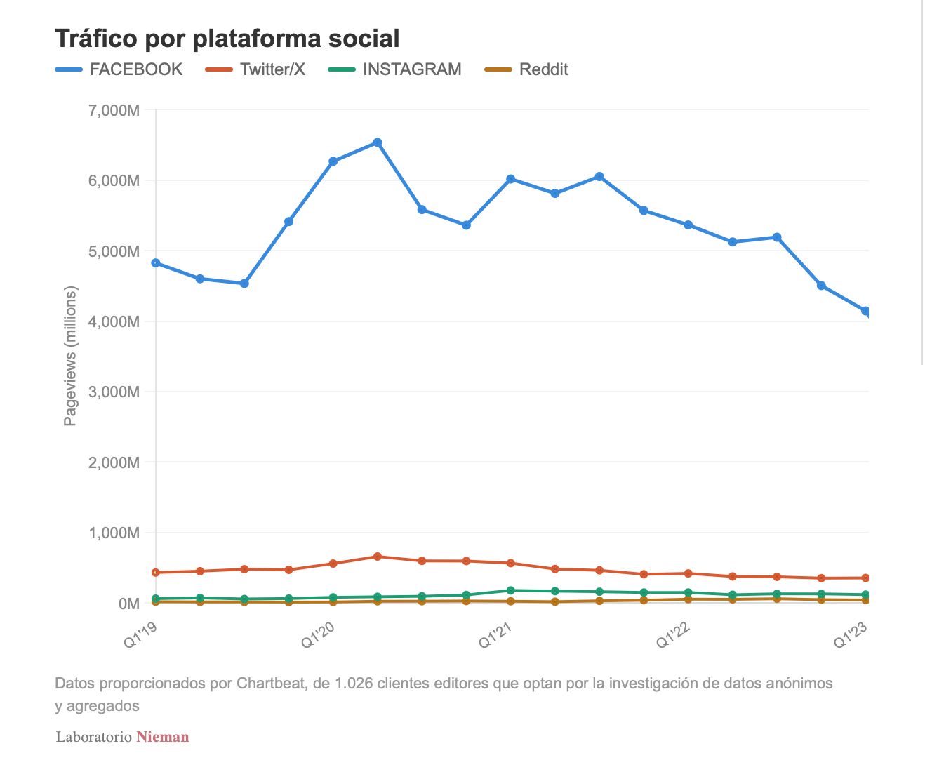 El fenómeno no es aislado. El informe también detecta un descenso pronunciado en las visitas provenientes de Facebook, otra de las plataformas que durante más de una década funcionó como un canal clave para la distribución de contenidos periodísticos.