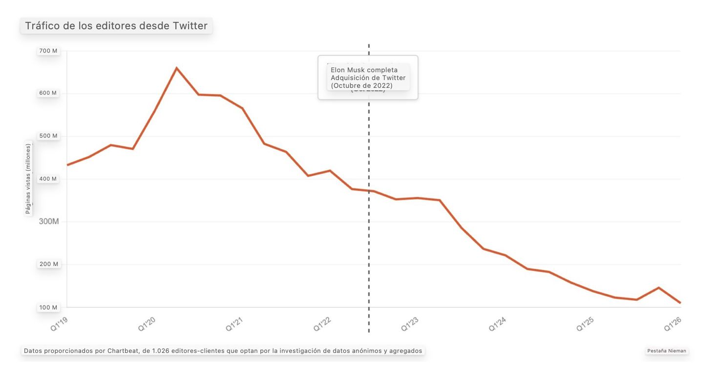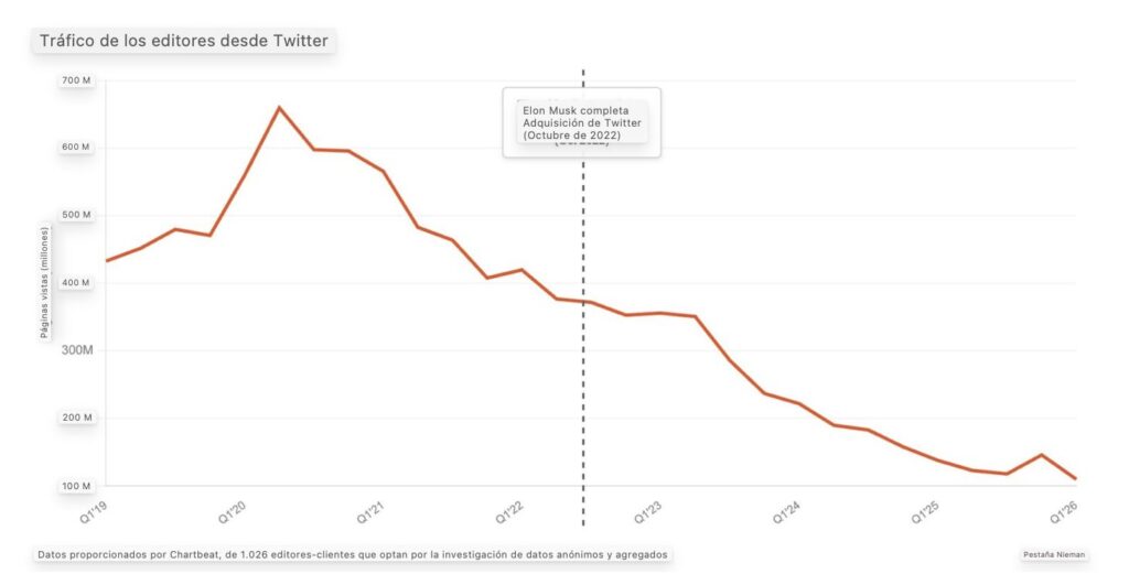 El análisis, firmado por la editora Laura Hazard Owen, se apoya en datos de la firma de analítica Chartbeat y muestra una caída contundente: el tráfico global hacia medios desde Twitter se redujo un 70% desde 2022, año en que la red social fue adquirida por Elon Musk.