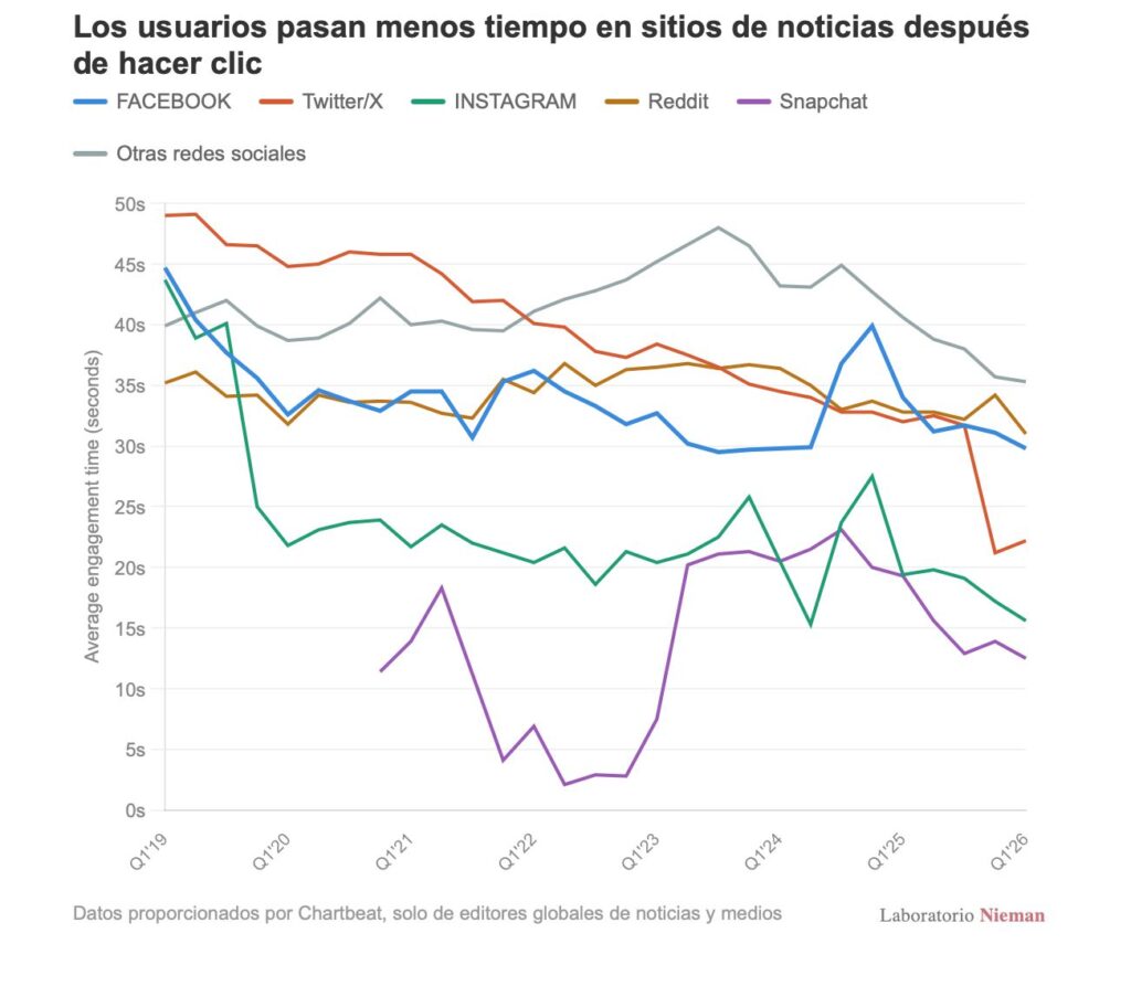 A este escenario se suma un dato que agrava la situación: incluso cuando los usuarios llegan a los sitios de noticias desde redes sociales, pasan menos tiempo consumiendo contenido. Es decir, no solo hay menos clics, sino también menor calidad en ese tráfico.